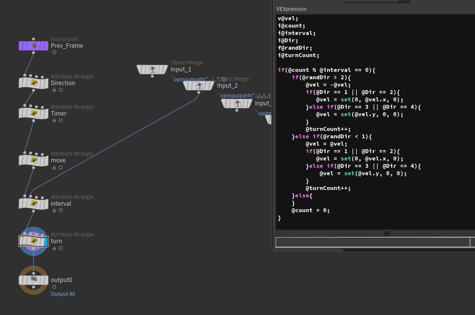 방향전환에 대한 wrangle은 위에서 설명했던 것처럼, 지속적으로 올라가고 있는 카운트 숫자를 interval 값과 mod 연산을 진행해서 조건문에 mod 연산이 0과 같다면 방향전환을 수행할 것을 적어주었다.