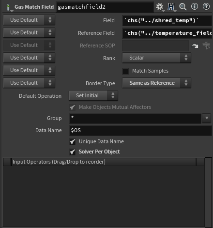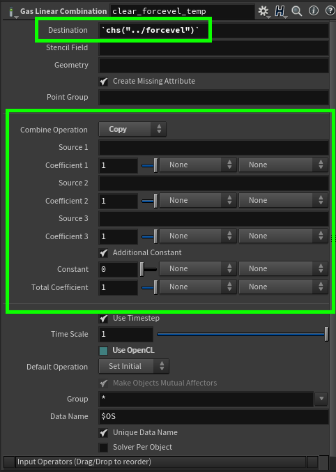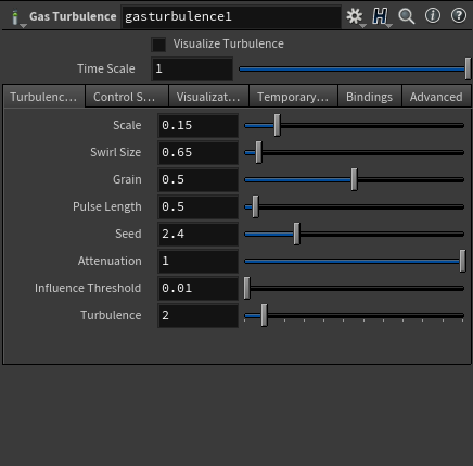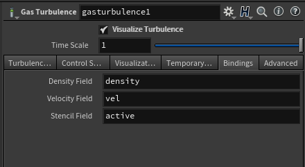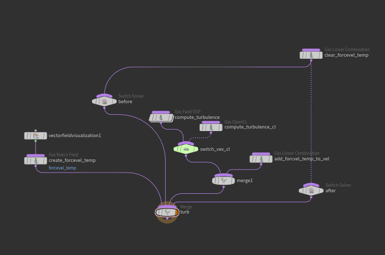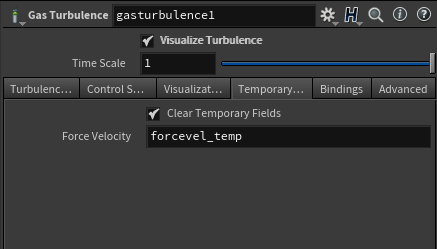 임시 field로 forcevel_temp field를 velocity field를 복제함으로써 만들어주고, turbulence를 계산하고, velocity field에 더해준 뒤, gas linear combination 노드를 사용해서 forcevel_temp field를 비어있는 field로 만들어준다.