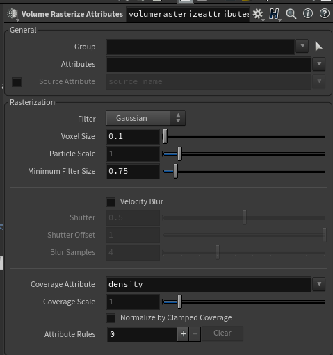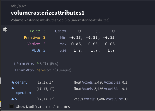 pyro source 노드 하나만으로 세팅이 끝나는 것은 아니다. 이 노드는 우리가 어떤 볼륨 정보를 만들고 싶은지 그 정보가 될 포인트를 만들어주게 되고, volume rasterize attribute 노드로 포인트를 볼륨으로 바꿔주는 과정이 따로 필요하다.
