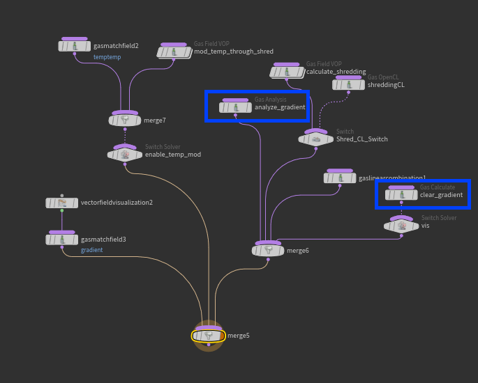 - gradient field 안에 있는 gradient 정보를 날려주면서(source pre-mult 가 0으로, gradient에 0을 곱해줘서 날려버린다.) gradient field는 비어있게 되고, Gas Shred 노드의 계산이 끝나고 밖으로 나가게 되면 gradient field는 사라진다.