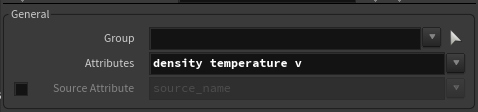 pyro source 세팅을 할 때, attribute를 추가해주고, attribute가 custom인 상태에서 각각 name을 적어준다.(여기에서는 density, temperature, vel로 적어줬다.) 그리고 Attribute를 각각에 맞는 attribute로 선택해준다.