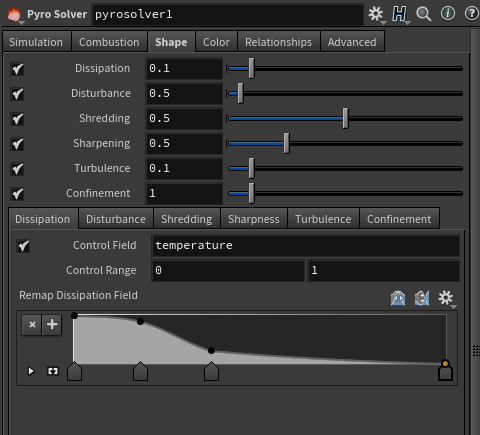 그런데 기왕이면 디시페이트를 제일 먼저 적용해서 정하고 작업하는 것이 좋다. 만약 디시페이트를 작업의 맨 뒤로 보낸다면, 터뷸런스, 슈레드, 디스터브같이 shape이 바뀌는 효과를 먼저 사용하게 되는데, 이 노드들은 적용을 하자마자 시각적으로 화려하게 보이기 때문에 작업자 스스로 집착이 생길 우려가 있다. 불처럼 보이려면 적당하게 증발해야하는데, 증발되지 않은 상태에서 위쪽에서 표현되는 현란한 터뷸런스같은 것들을 포기하기가 어려워진다.