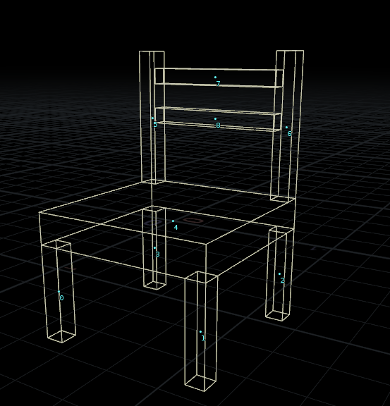 만약 0번 포인트로 대변되는 다리(legA)와 4번 포인트로 대변되는 시트(seat)의 constraint를 만들어줘야한다면, 다리와 시트의 접합부분에 각각의 물체가 대변되는 (이름이 같은)포인트들이 위치하고 있어야한다.