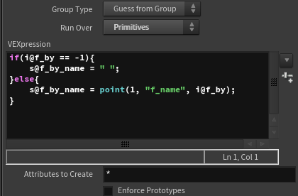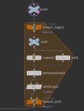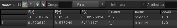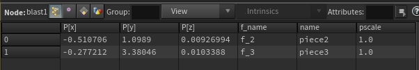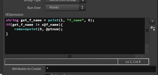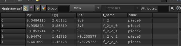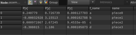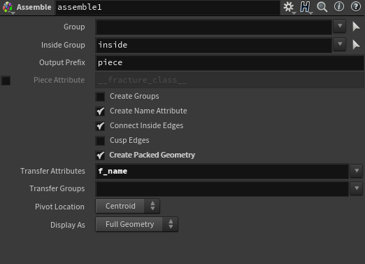 voronoi fracture에 대해 assemble 노드를 연결해줄 때, Transfer Attributes에 위의 @f_name을 기입해주면, packing되면서 생성되는 물체를 대변하는 포인트에도 @f_name이 추가된 것을 확인할 수 있다.