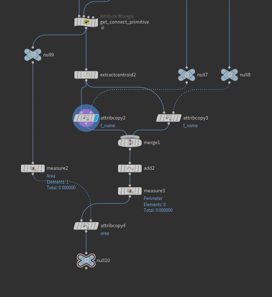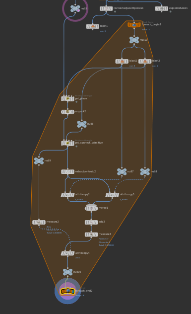 두개의 조각을 대변해주는 포인트로 만들기 위해 attribute copy 노드로 각 조각의 s@f_name 정보를 가져오고, 두 포인트를 add 노드로 연결해서 primitive로 만들어줬다. 또한 area 정보가 있으면 나중에 glue constraint 에서 strength에 활용할 수 있으므로, area 정보를 primitive에 추가해줬다.