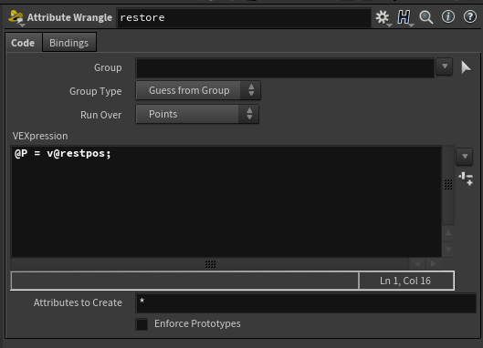 원래 위치로의 복원을 원한다면, Attribute Wrangle을 활용해서 각 포인트의 위치에 대해 restpos로 복원을 해주면 될 것이다.
