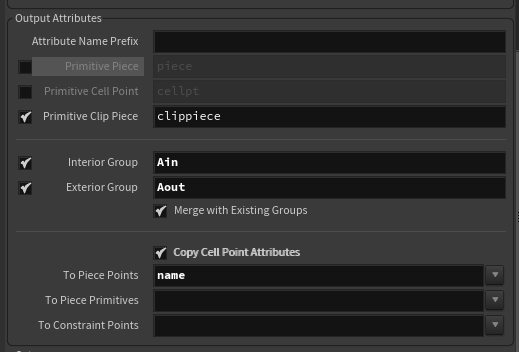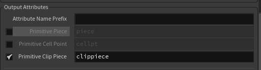 이 정보를 생성해주는 방법은 voronoi fracture 노드의 Output Attributes 항목에서 Primitive Clip Piece를 활성화해주는 것이다.