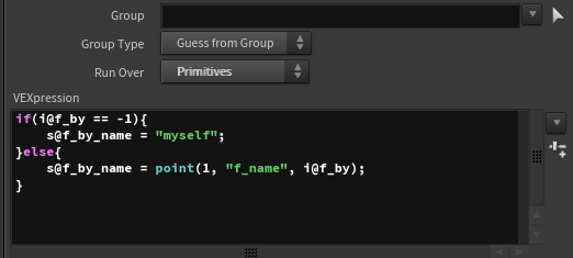 voronoi fracture의 parameter 중 Copy Cell Point Attributes 를 체크해주고 To Piece Points에 name을 기입해주면, 각 조각의 모든 포인트에 대해 조각의 이름정보 @name이 저장된다.