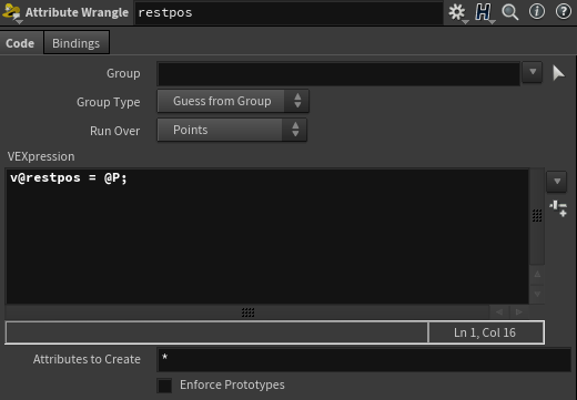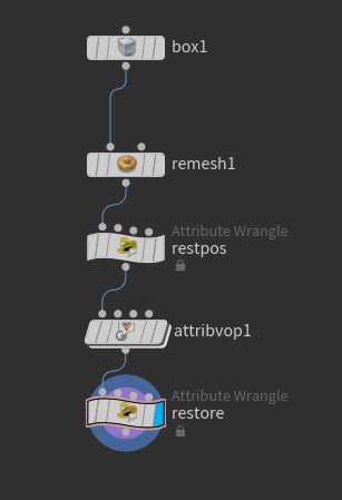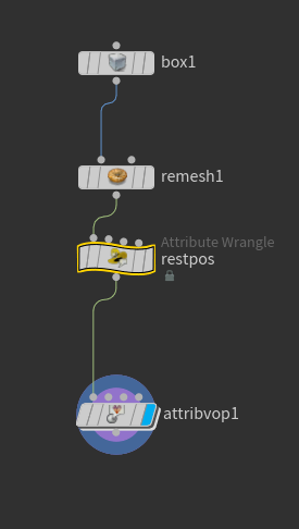 그래서 물체의 위치에 대해 변형을 가하기 전, 각 포인트의 현재 위치를 v@restpos 라는 어트리뷰트에 저장해두는 것이다.