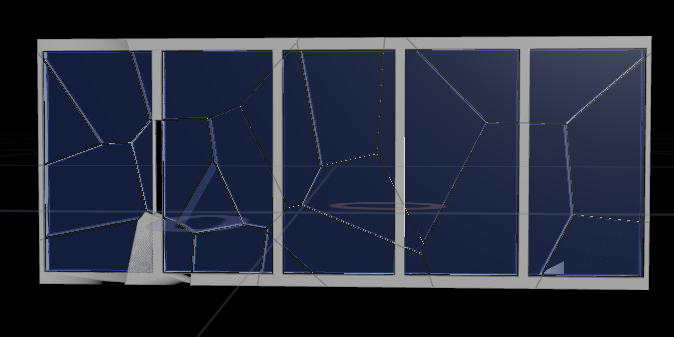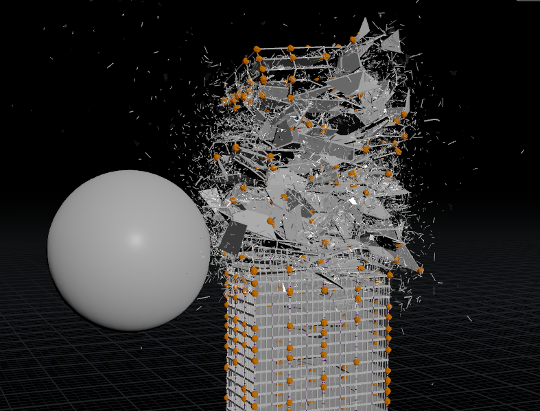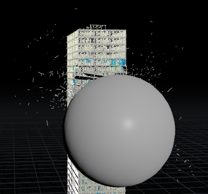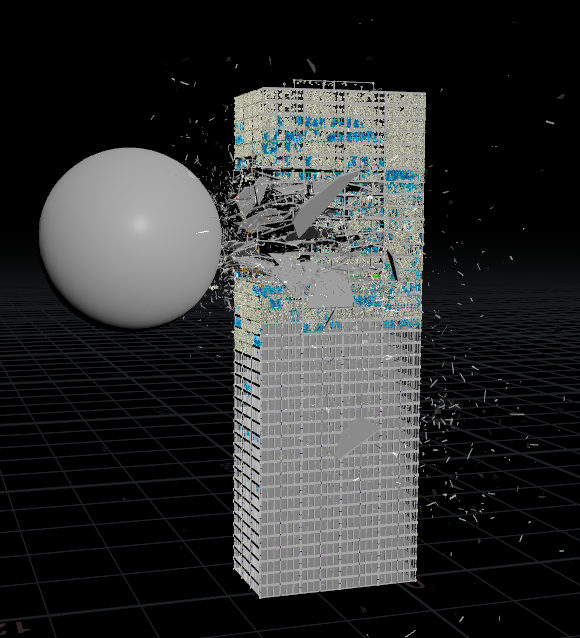 창문을 붙인 이후로 충격량을 창문에서 대부분 흡수하는 것인지 박살은 잘 안나고 충돌체는 튕겨져나가는 상황이 발생!! 혹시나 싶어서 창문의 constraint 생성 수량도 좀 줄여주고 창문의 조각도 조금 줄여줬더니 잡아주는 힘이 조금이나마 줄어서 그런가 그래도 빌딩이 조금 부서지는 시뮬레이션 결과가 보이긴 한다. 하지만 원하는 느낌은 충돌체가 건물을 뚫어버리는 것인데 좀 더 수정이 필요할 듯 싶다.
